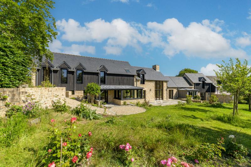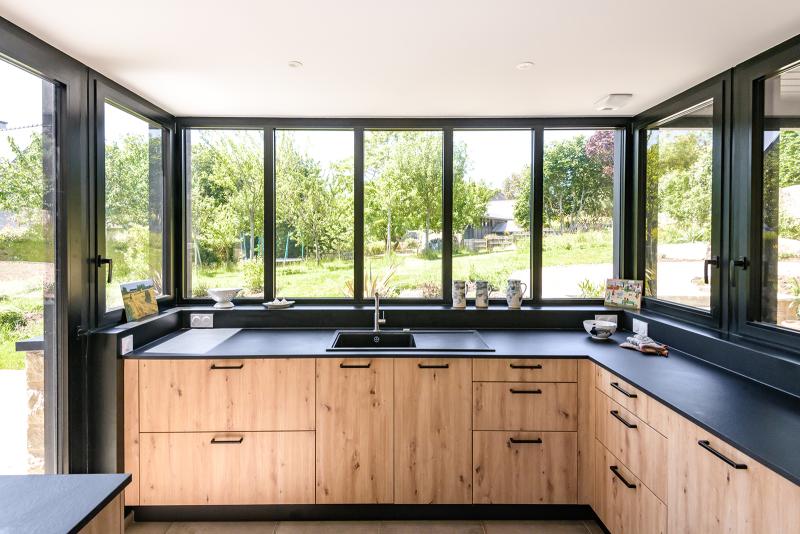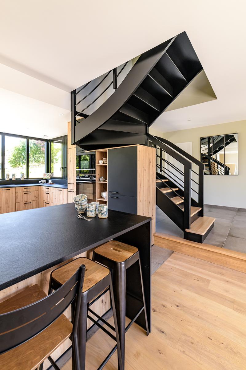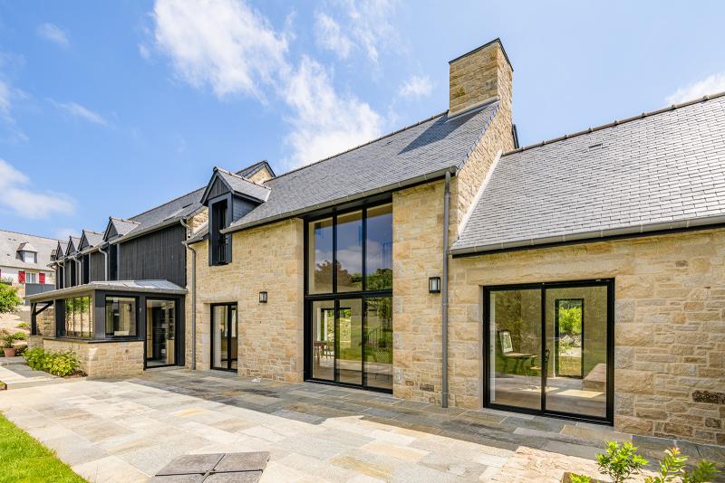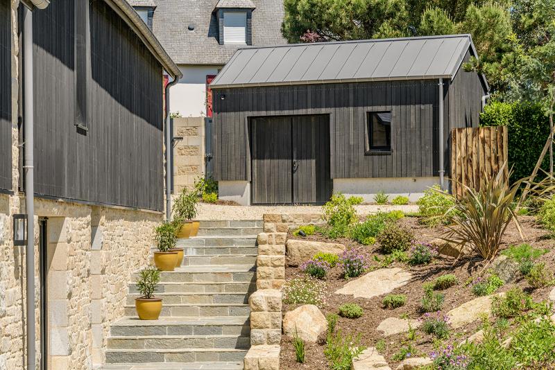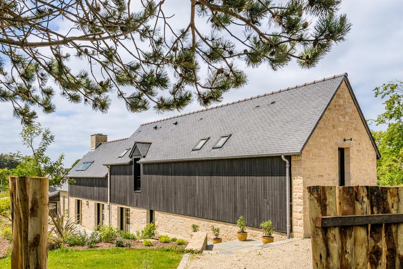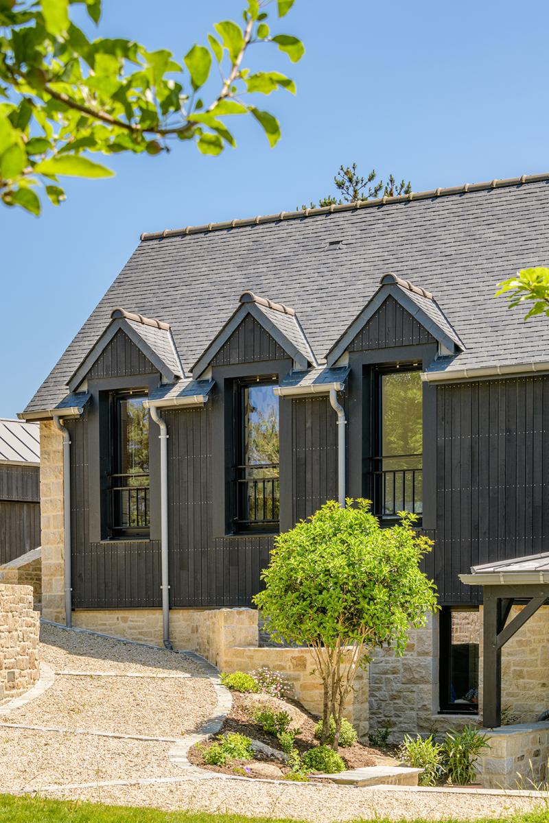 Cet impressionnant linéaire est animé côté jardin par des variations de hauteur, par un jeu en façade sur les pleins et les vides, et par la mise en œuvre de différents complexes constructifs : la maçonnerie parée d’une pierre de pays et l’ossature bois parée d’un bardage sombre. Les volumes en saillie chapeautés de zinc délimitent l’entrée et les terrasses pour les deux maisons, tout en abritant leurs cuisines. Côté rue, la façade est moins ouverte et plus sobre, limitant le bruit perçu depuis les pièces intérieures.