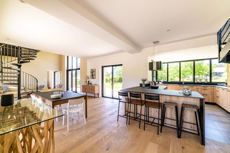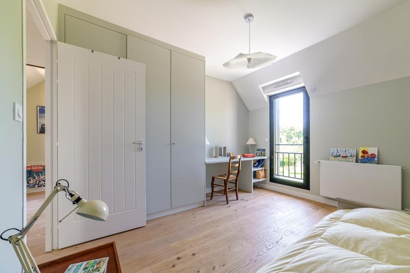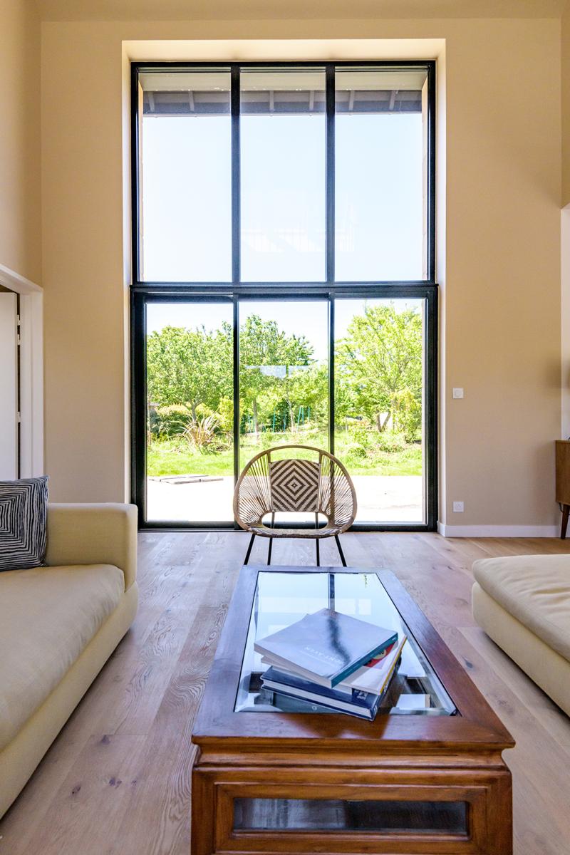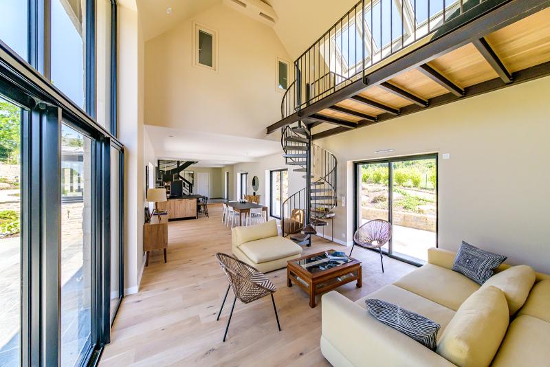 Ces pièces offrent de jolis volumes, avec de belles doubles hauteurs, permettant de baigner de lumière le salon et sa petite mezzanine dévolue à la lecture. Un salon de musique prend également place parmi ces volumes, où l’acoustique a été particulièrement travaillée par un jeu de plafond