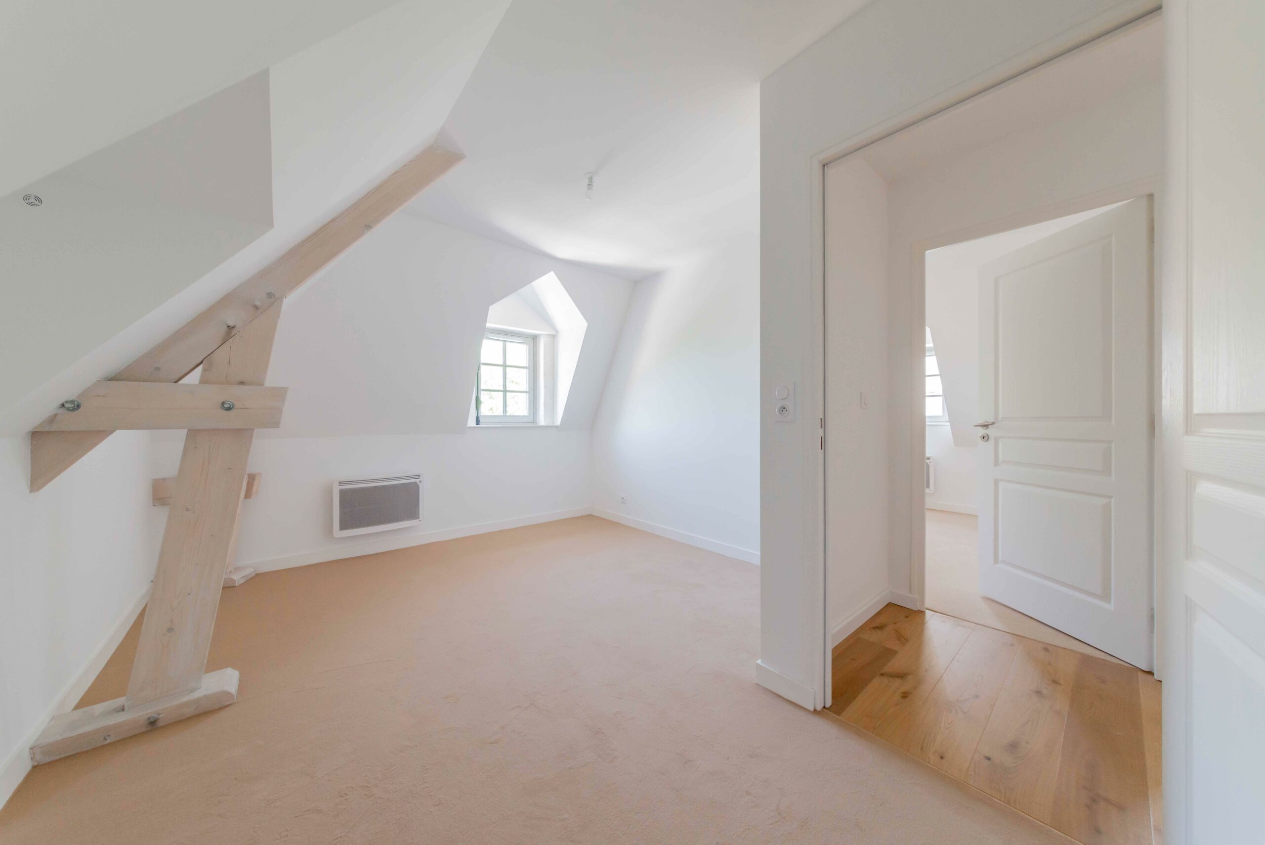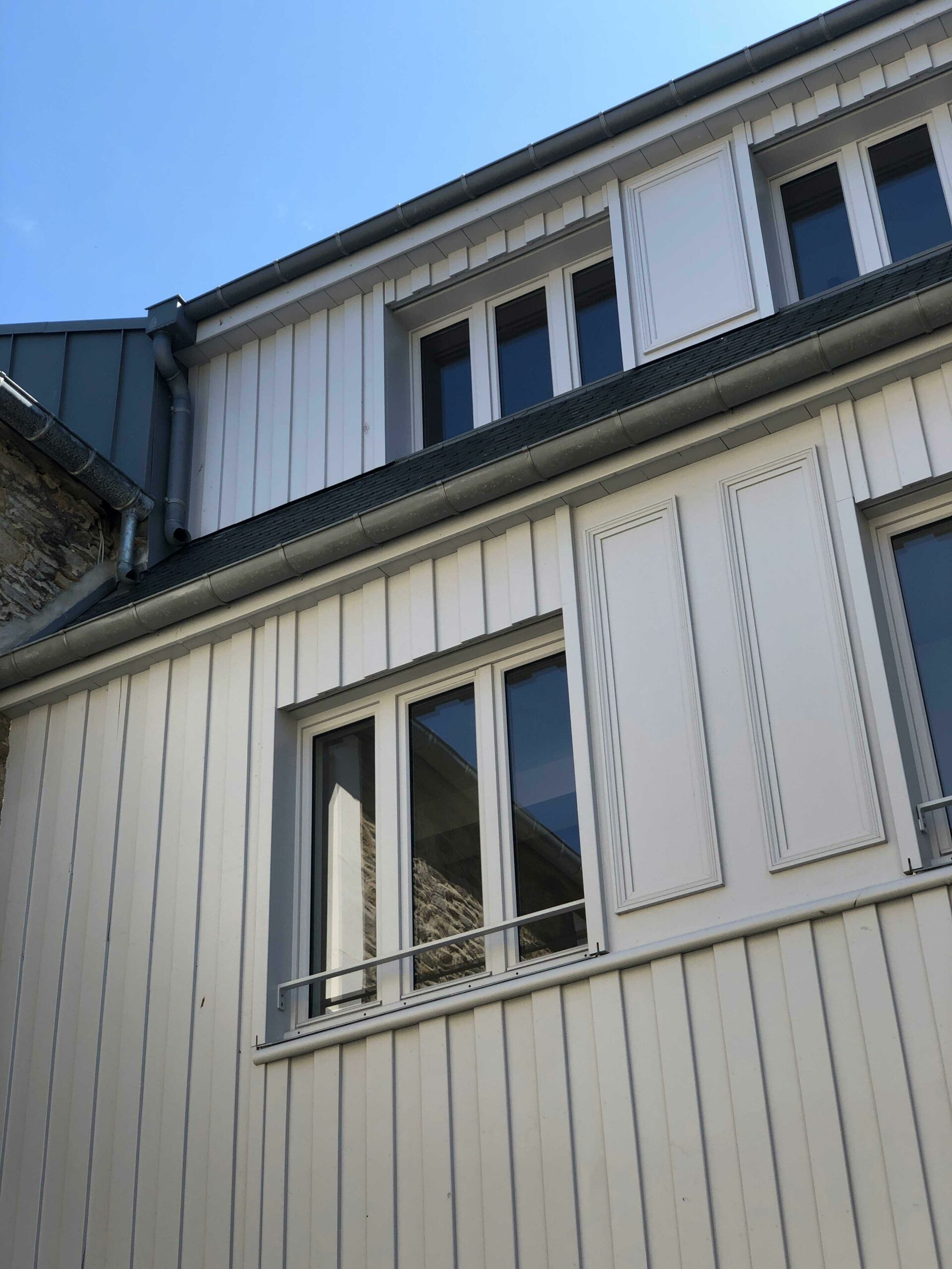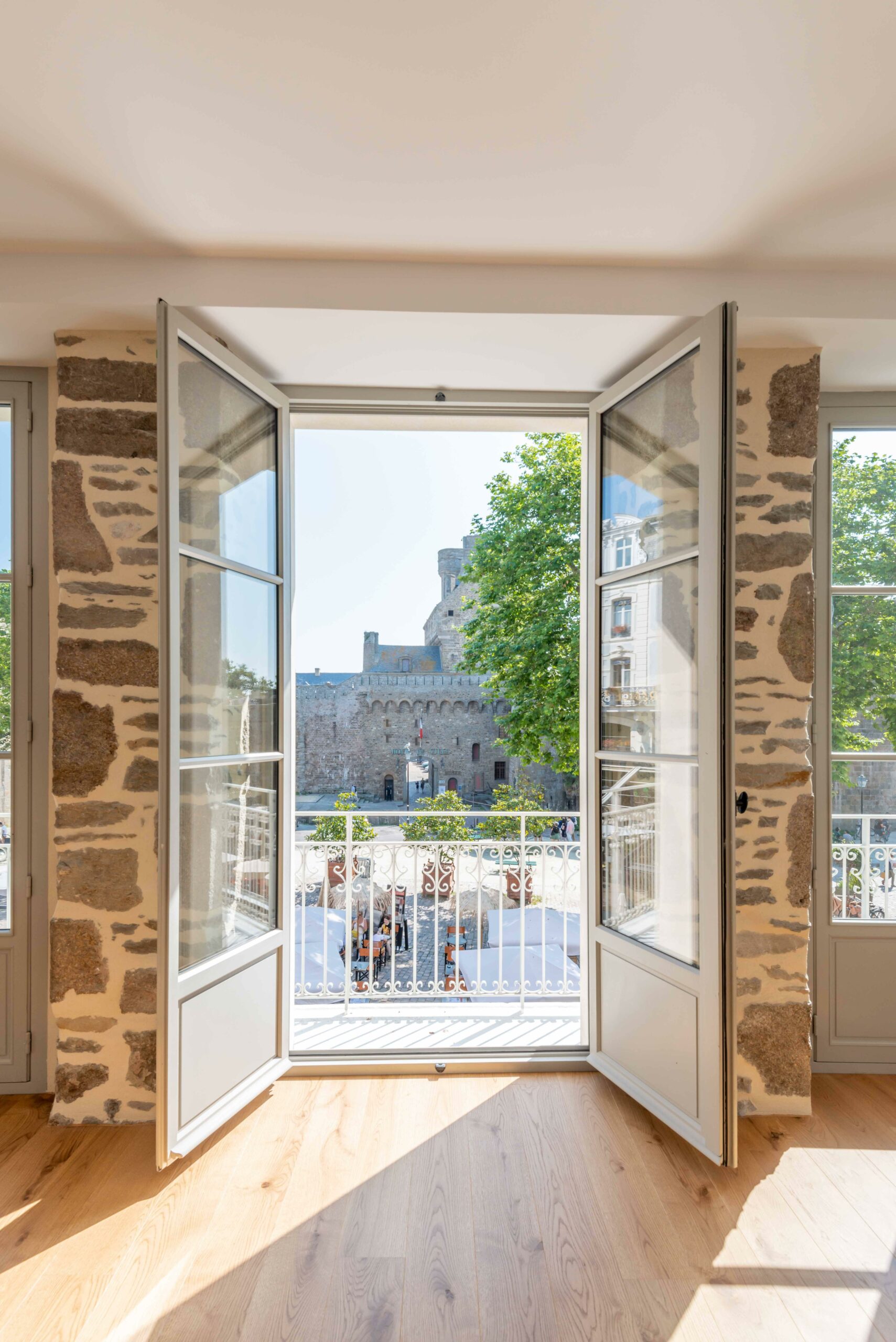 Situé en regard de la porte Saint-Vincent, un très beau projet de restauration d’un bâtiment du XVIIème siècle, avec une restitution des modénatures en enduit, et le démontage suivi d’un remontage à l’identique des lucarnes en pierres donnant sur la place Chateaubriand. Les ouvrages de ferronnerie (balcons et barres d’appui) ont fait l’objet d’un dessin original respectant l’esprit d’origine. La façade sur cour est traité avec autant d’égard que celle sur rue, avec un pannelage de châtaignier.