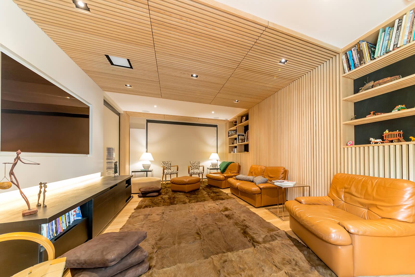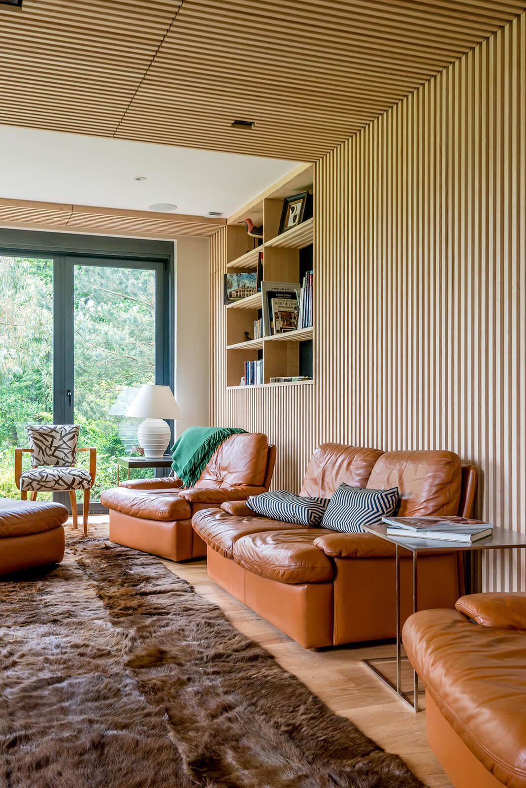 Le revêtement en tasseaux de bois structure visuellement la pièce, tout en offrant une ambiance calme et un grand confort acoustique, que ce soit lors de la contemplation de la nature ou du visionnage d’un film.
