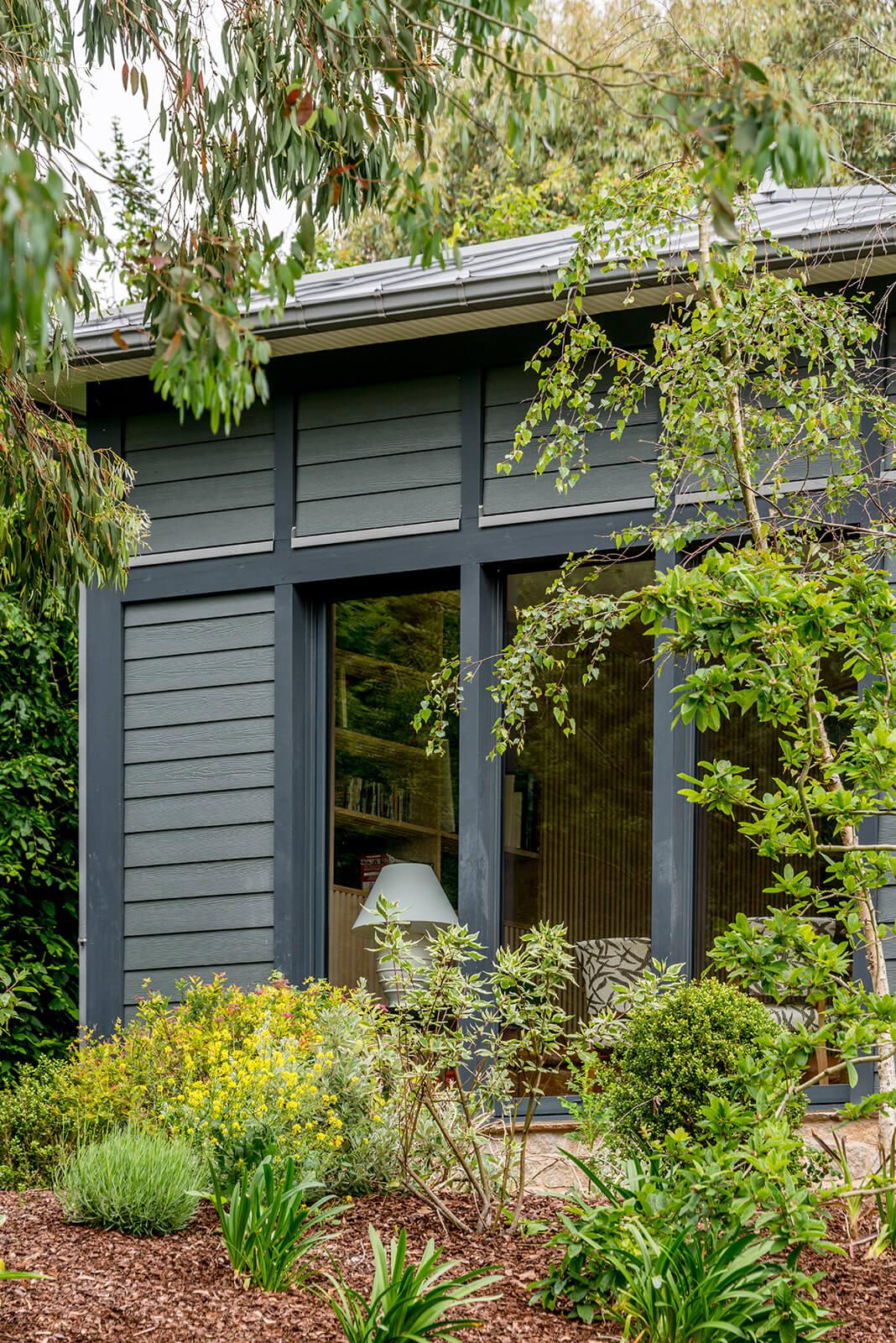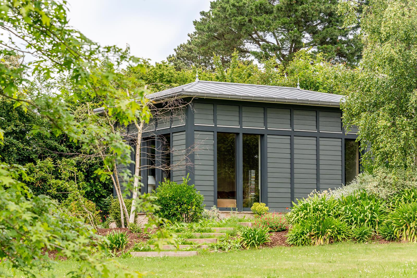 Cette extension s’avance dans le jardin et permet de profiter de la vue de la nature depuis un nouveau salon, tout en pouvant se transformer en salle de cinéma. Un système centralisé permet alors une occultation totale et une gestion fine de la luminosité de la pièce.