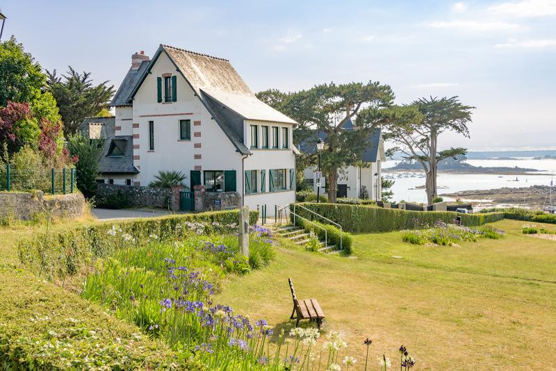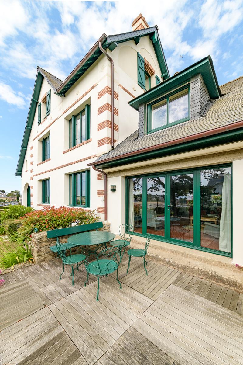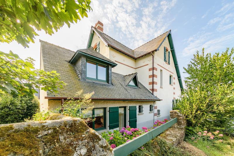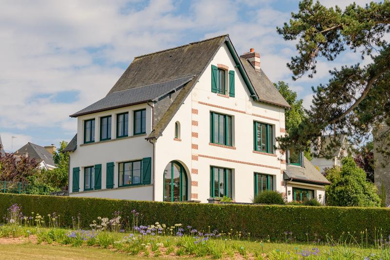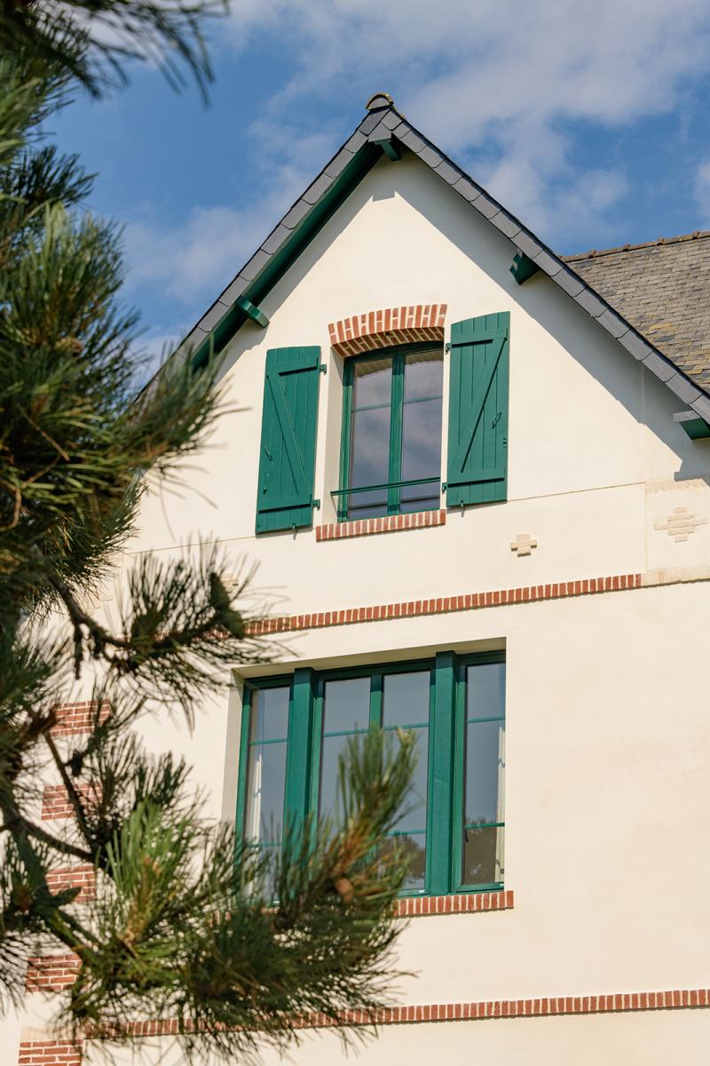 Cette maison face au Nessay présentait une triste figure, avec un enduit ciment uniformément blanc qui présentait de nombreuses coulures et empêchait la pierre de respirer. Cet enduit a été piqueté et remplacé par un enduit chaux naturelle, et nous avons profité du ravalement pour rétablir les modénatures initiales. La reconstitution s’est basée sur les traces existantes sur la maison, accompagné d’un travail sur des cartes postales d’époque.