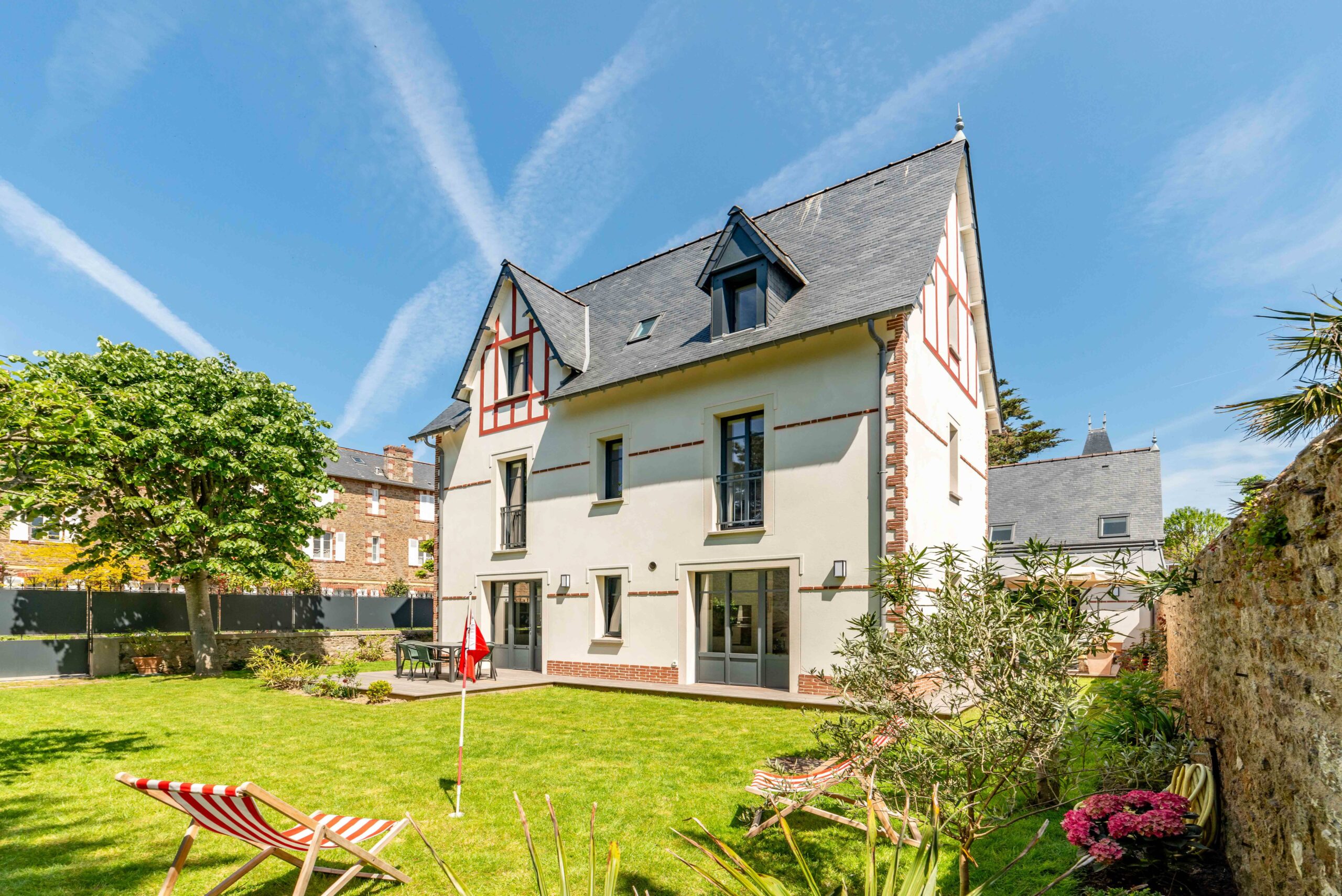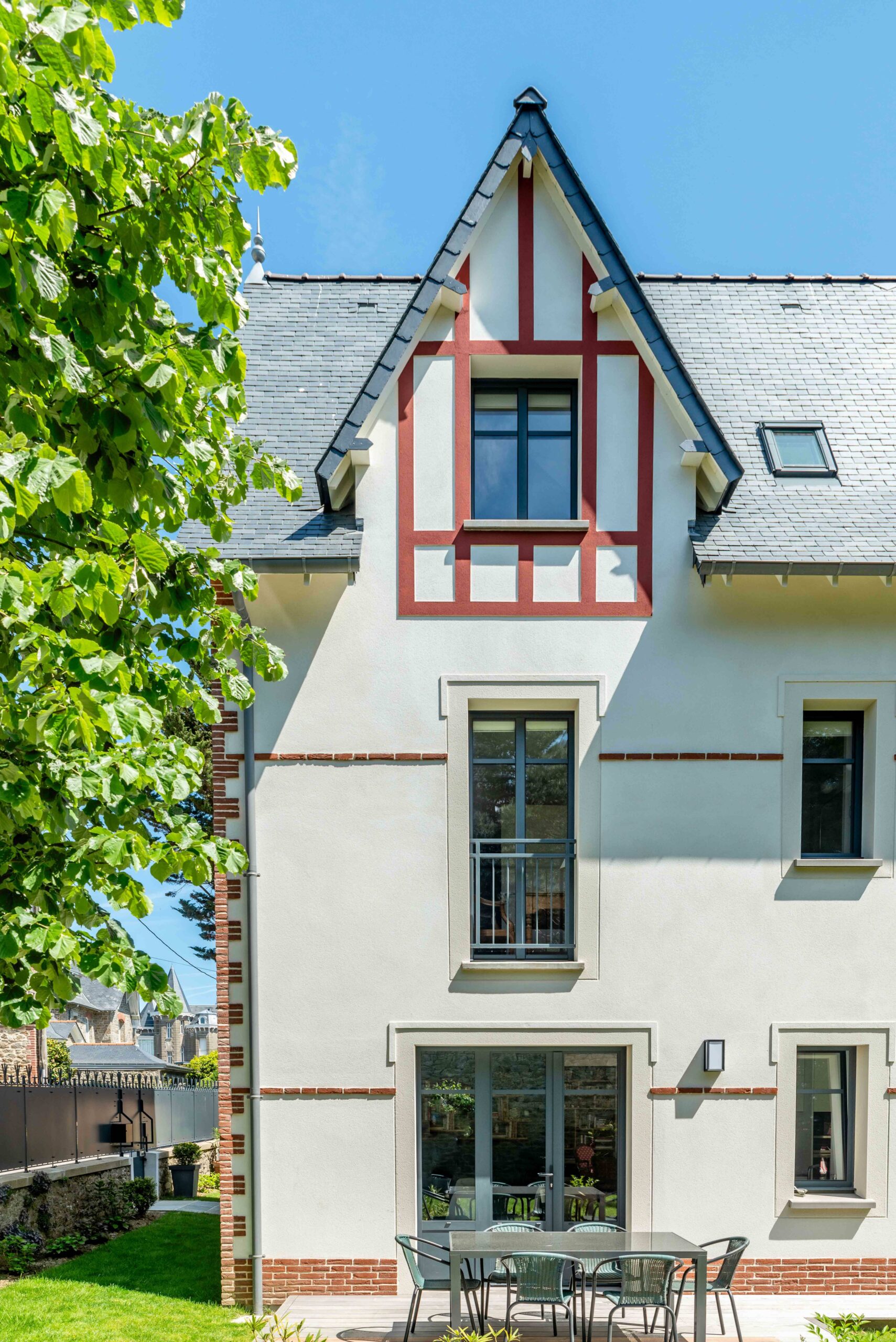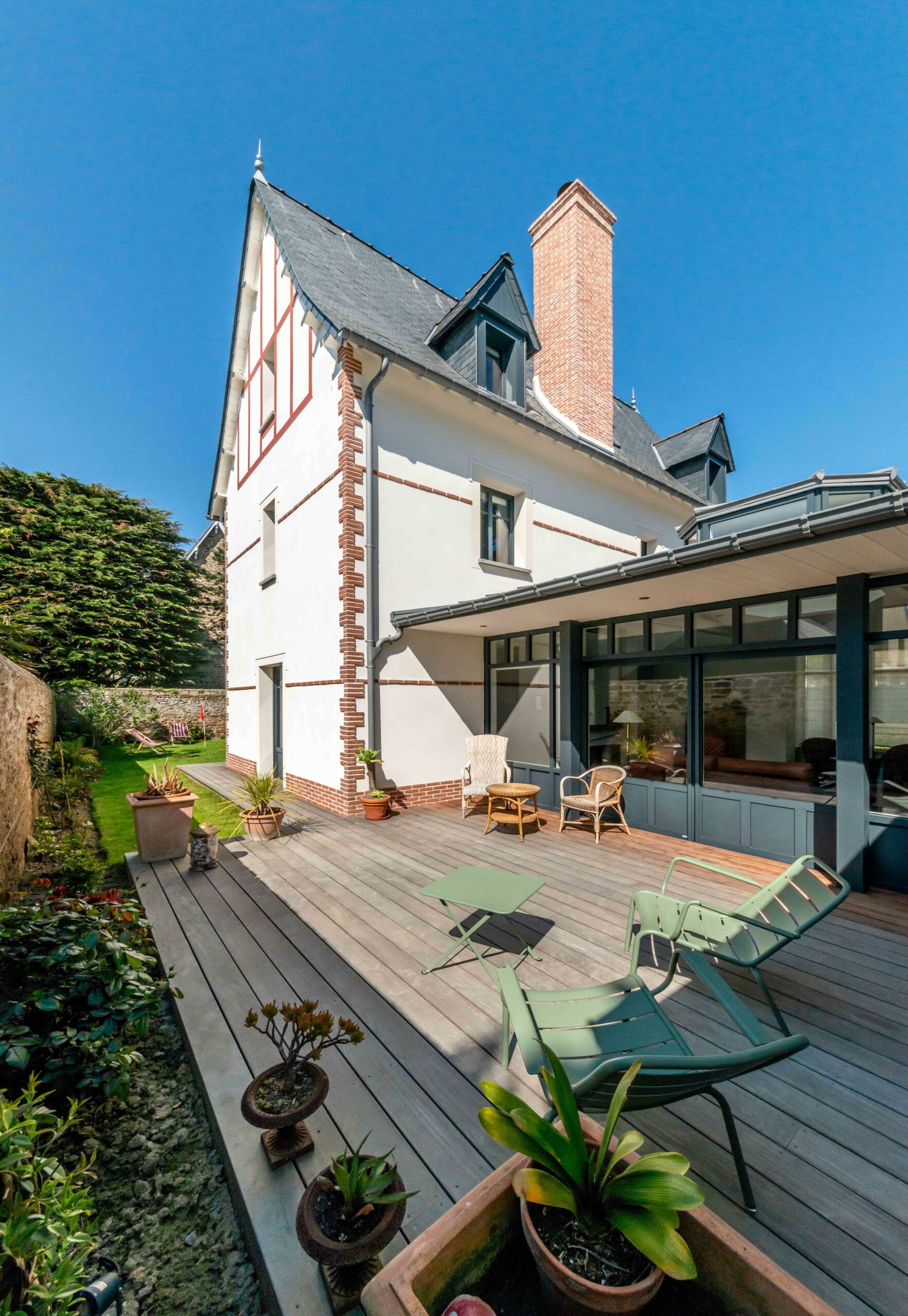 Cette maison neuve est une réecriture moderne de la villa balnéaire typique du quartier de la Malouine. Le corps principal de deux étages s’implante au centre de la parcelle, et est complété avec un volume secondaire décalé, abritant un garage. Les élévations de ces éléments reprennent des modénatures en brique sur l’enduit (soubassement, chaîne d’angle, bandeaux horizontaux), et leurs pignons sont affirmés par un rappel des colombages traditionnels.
