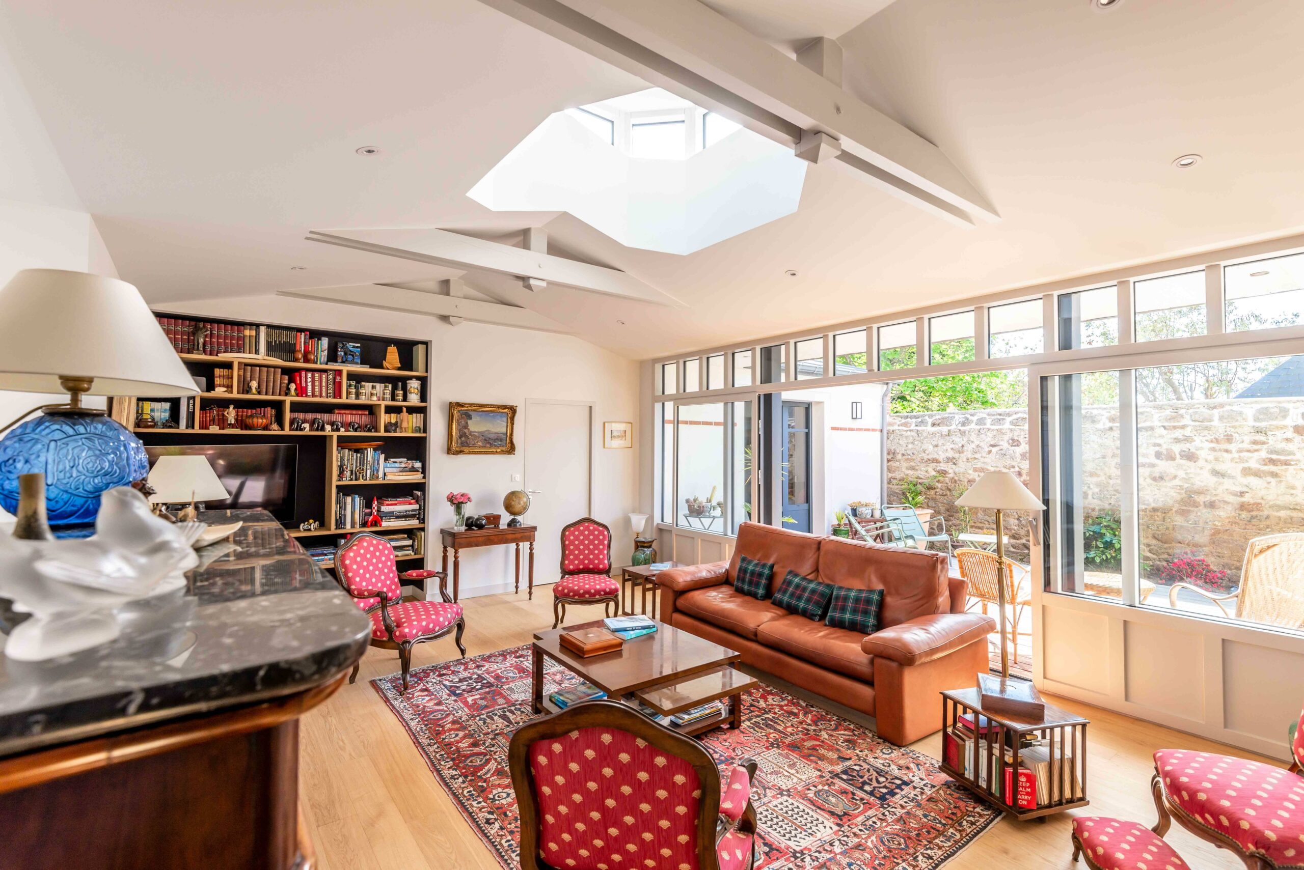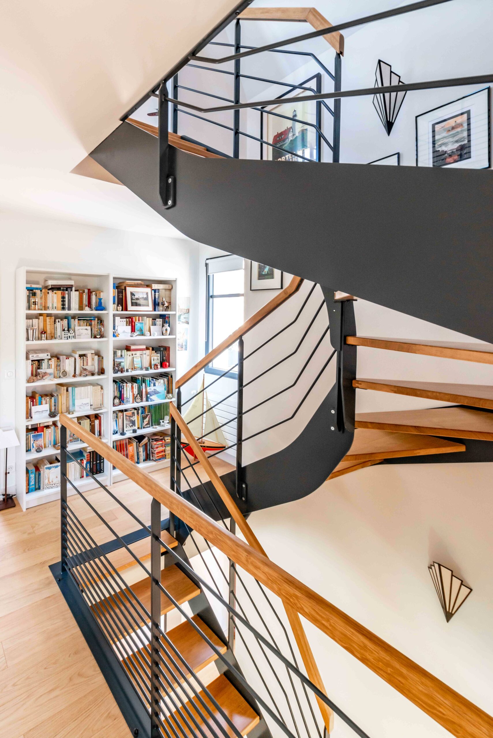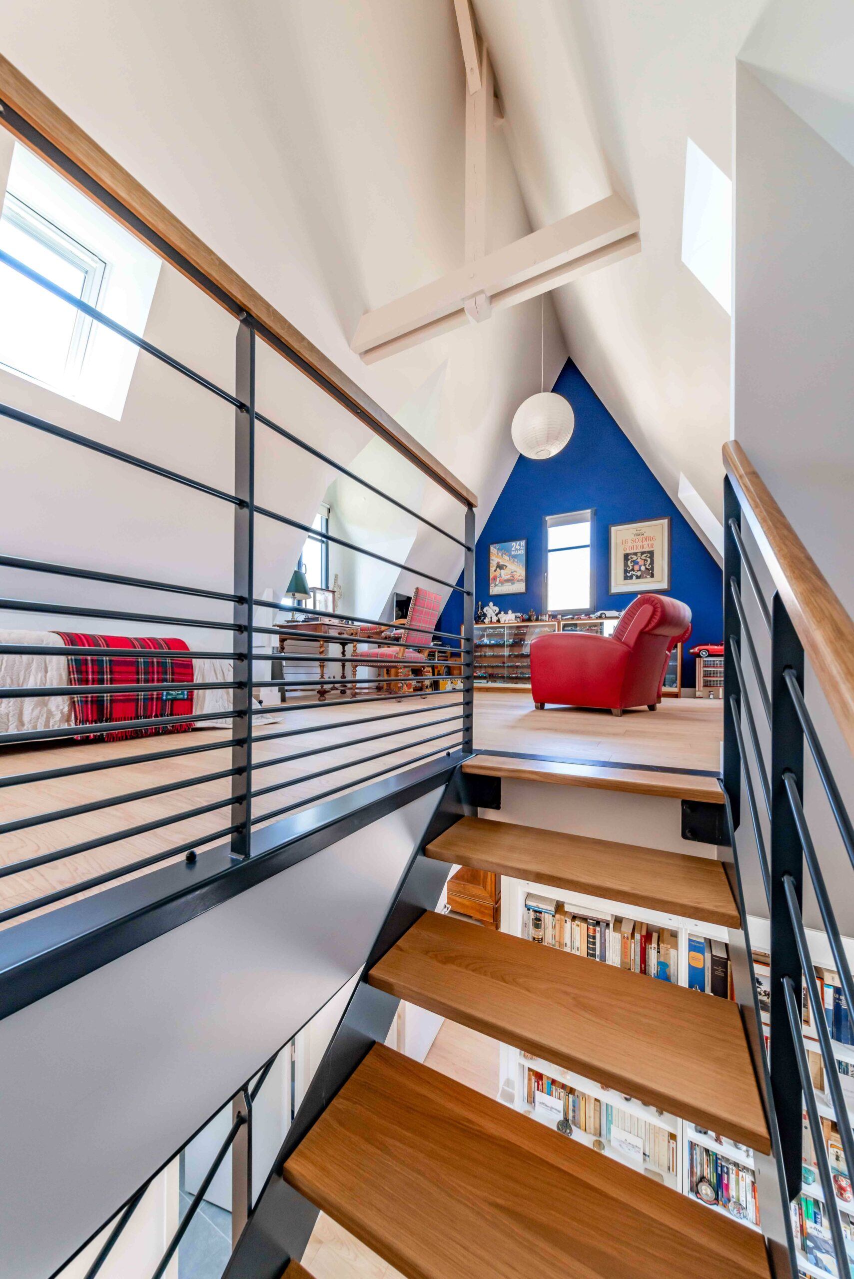 Les volumes principaux sont liés par une aile basse qui abrite le salon. Cette pièce bénéficie d’une lumière généreuse, grâce à son lanternon en plafond et bow-window côté rue, qui reprennent le vocabulaire architectural des villas alentour. Le corps principal est quant à lui désservi par un escalier de métal et de bois, qui sert de colonne vertébrale à la maison.